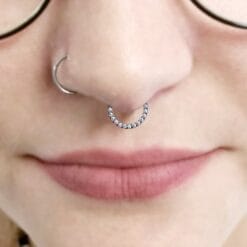 Aro clicker de titanio grado implante ASTMF-136 con baño de oro rosa y zirconias frontales. Piercing de nariz ideal para septum. Piercing de oreja ideal para daith, hélix, lóbulo alto… De nuestra marca ZLP.