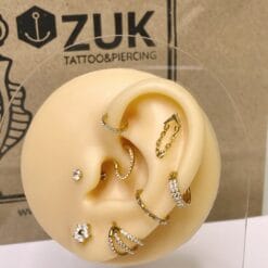 Top de titanio grado implante ASTMF-136, baño de oro de 24 Kt y una cadena. De nuestra marca ZLP. Piercing de oreja ideal para hélix.